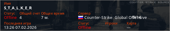 Играет на Counter Strike Source сервере. Страна: РоссияПервый раз замечен 13:20 07.02.2026
