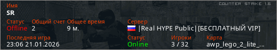 Играет на Counter Strike 1.6 сервере. Страна: РоссияПервый раз замечен 22:34 21.01.2026