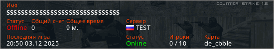 Играет на Counter Strike 1.6 сервере. Страна: РоссияПервый раз замечен 13:31 29.11.2025