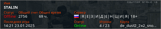 Играет на Counter Strike 1.6 сервере. Страна: РоссияПервый раз замечен 20:42 28.02.2022