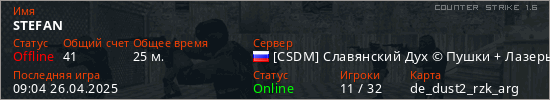 Играет на Counter Strike 1.6 сервере. Страна: РоссияПервый раз замечен 07:30 23.04.2025