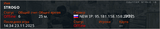 Играет на Counter Strike 1.6 сервере. Страна: РоссияПервый раз замечен 17:55 05.10.2025