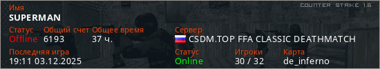 Последний раз был в сети 19:11 03.12.2025 Игрок с таким ником замечен на 18 серверах