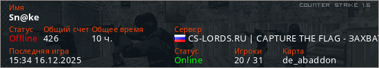 Играет на Counter Strike 1.6 сервере. Страна: РоссияПервый раз замечен 01:30 12.07.2021
