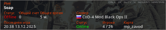 Играет на Call of Duty 4: Modern Warfare сервере. Страна: РоссияПервый раз замечен 20:36 13.12.2025