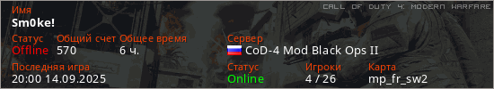 Играет на Call of Duty 4: Modern Warfare сервере. Страна: РоссияПервый раз замечен 16:33 06.01.2024
