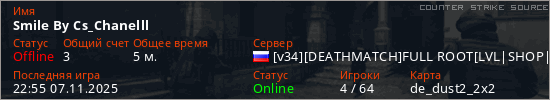 Играет на Counter Strike Source сервере. Страна: РоссияПервый раз замечен 22:47 07.11.2025