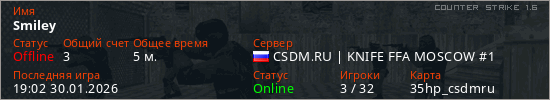 Играет на Counter Strike 1.6 сервере. Страна: РоссияПервый раз замечен 18:58 30.01.2026