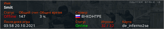 Играет на Counter Strike 1.6 сервере. Страна: РоссияПервый раз замечен 11:45 06.03.2020