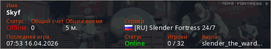 Играет на Team Fortress 2 сервере. Страна: РоссияПервый раз замечен 07:51 16.04.2026