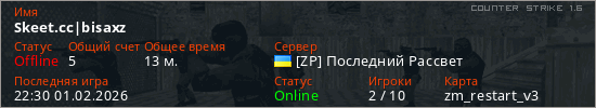 Играет на Counter Strike 1.6 сервере. Страна: УкраинаПервый раз замечен 21:44 01.02.2026