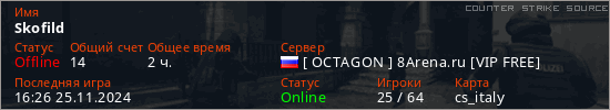 Играет на Counter Strike Source сервере. Страна: РоссияПервый раз замечен 18:41 19.06.2024