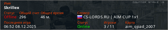 Играет на Counter Strike 1.6 сервере. Страна: РоссияПервый раз замечен 09:24 27.08.2024