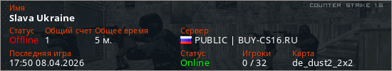 Играет на Counter Strike 1.6 сервере. Страна: РоссияПервый раз замечен 17:42 08.04.2026