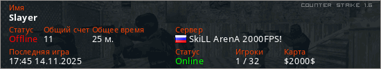 Играет на Counter Strike 1.6 сервере. Страна: РоссияПервый раз замечен 14:56 07.04.2025