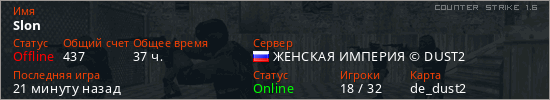 Играет на Counter Strike 1.6 сервере. Страна: РоссияПервый раз замечен 16:20 17.05.2025