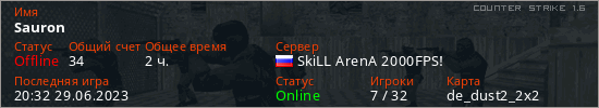 Играет на Counter Strike 1.6 сервере. Страна: РоссияПервый раз замечен 15:52 08.01.2023