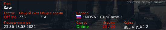 Играет на Counter Strike Source сервере. Страна: РоссияПервый раз замечен 20:30 05.08.2022