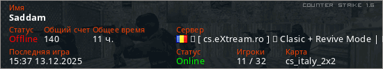 Играет на Counter Strike 1.6 сервере. Страна: РумынияПервый раз замечен 02:11 11.12.2024