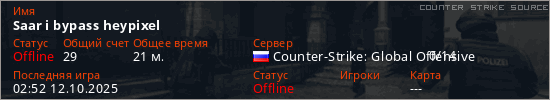 Играет на Counter Strike Source сервере. Страна: РоссияПервый раз замечен 15:58 11.10.2025