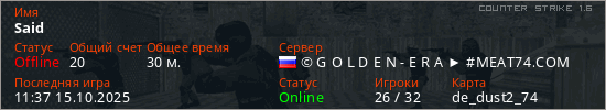 Играет на Counter Strike 1.6 сервере. Страна: РоссияПервый раз замечен 22:10 08.10.2023