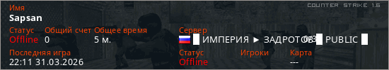 Играет на Counter Strike 1.6 сервере. Страна: РоссияПервый раз замечен 22:02 31.03.2026