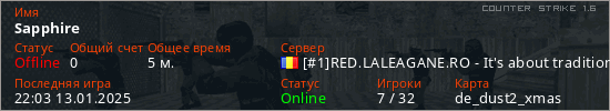 Играет на Counter Strike 1.6 сервере. Страна: РумынияПервый раз замечен 21:57 13.01.2025