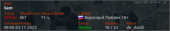 Играет на Counter Strike 1.6 сервере. Страна: РоссияПервый раз замечен 15:58 02.11.2019
