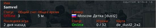 Играет на Counter Strike 1.6 сервере. Страна: РоссияПервый раз замечен 21:47 17.03.2026