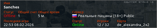 Играет на Counter Strike 1.6 сервере. Страна: РоссияПервый раз замечен 22:51 08.02.2026