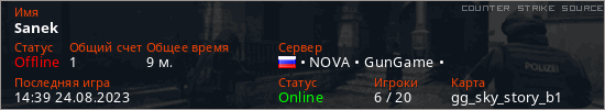 Играет на Counter Strike Source сервере. Страна: РоссияПервый раз замечен 16:49 08.03.2023