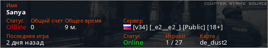 Играет на Counter Strike Source сервере. Страна: РоссияПервый раз замечен 18:32 21.01.2026