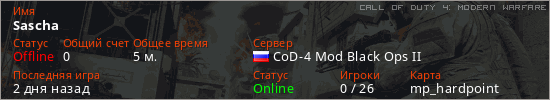 Играет на Call of Duty 4: Modern Warfare сервере. Страна: РоссияПервый раз замечен 22:22 27.04.2026