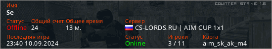 Играет на Counter Strike 1.6 сервере. Страна: РоссияПервый раз замечен 17:09 10.09.2024