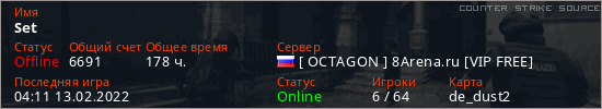 Играет на Counter Strike Source сервере. Страна: РоссияПервый раз замечен 19:29 22.12.2019