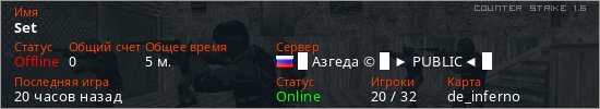 Играет на Counter Strike 1.6 сервере. Страна: РоссияПервый раз замечен 16:18 22.04.2026