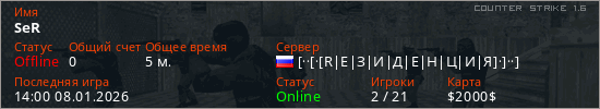 Играет на Counter Strike 1.6 сервере. Страна: РоссияПервый раз замечен 13:52 08.01.2026