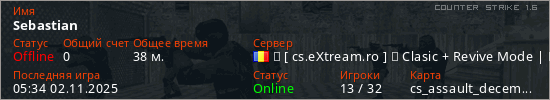 Играет на Counter Strike 1.6 сервере. Страна: РумынияПервый раз замечен 14:08 15.12.2024