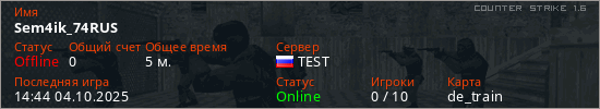 Играет на Counter Strike 1.6 сервере. Страна: РоссияПервый раз замечен 14:30 04.10.2025