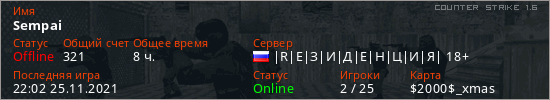 Последний раз был в сети 22:02 25.11.2021 Игрок с таким ником замечен на 24 серверах