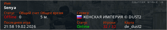 Играет на Counter Strike 1.6 сервере. Страна: РоссияПервый раз замечен 21:52 19.02.2026