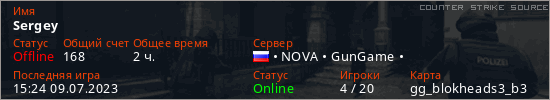 Играет на Counter Strike Source сервере. Страна: РоссияПервый раз замечен 20:10 16.12.2022