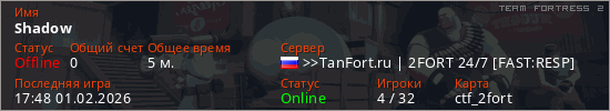 Играет на Team Fortress 2 сервере. Страна: РоссияПервый раз замечен 17:23 01.02.2026
