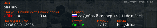 Играет на Counter Strike 1.6 сервере. Страна: РоссияПервый раз замечен 17:19 28.12.2025