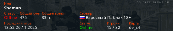 Играет на Counter Strike 1.6 сервере. Страна: РоссияПервый раз замечен 16:15 09.02.2022