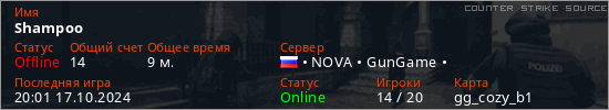 Играет на Counter Strike Source сервере. Страна: РоссияПервый раз замечен 19:54 16.10.2024