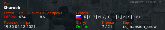 Играет на Counter Strike 1.6 сервере. Страна: РоссияПервый раз замечен 11:55 28.11.2021