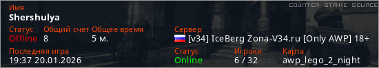 Играет на Counter Strike Source сервере. Страна: РоссияПервый раз замечен 19:12 20.01.2026