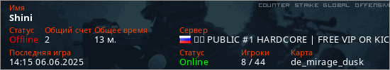 Играет на Counter Strike Global Offensive сервере. Страна: РоссияПервый раз замечен 20:35 03.06.2025