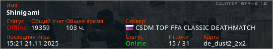 Последний раз был в сети 15:21 21.11.2025 Игрок с таким ником замечен на 24 серверах